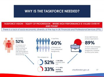 This taskforce is an opportunity to make a difference to diversity across the UK’s financial and professional services. Currently the sector has a lack of socio-economic diversity at the top. Across eight financial services organisations, 89% of senior level employees are from professional backgrounds. This compares to 47% at junior levels, 52% of UK CEOs economy wide and 33% of the UK’s working population.