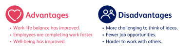 - Advantages: Work-life balance has improved, employees are completing work faster and well-being has improved.